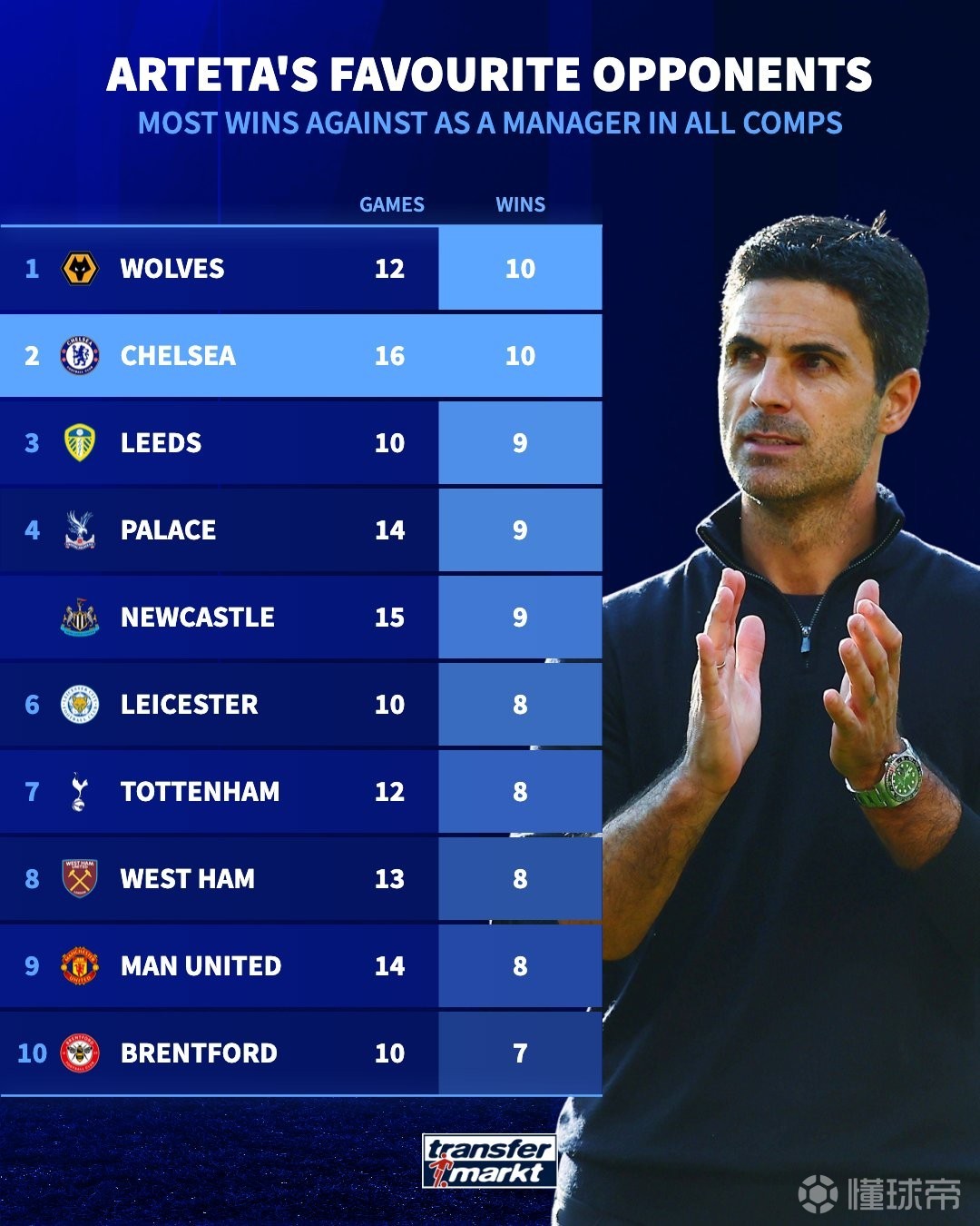 • 喜欢的对手,切尔西是阿尔特塔赢球最多的球队,16场取得10胜